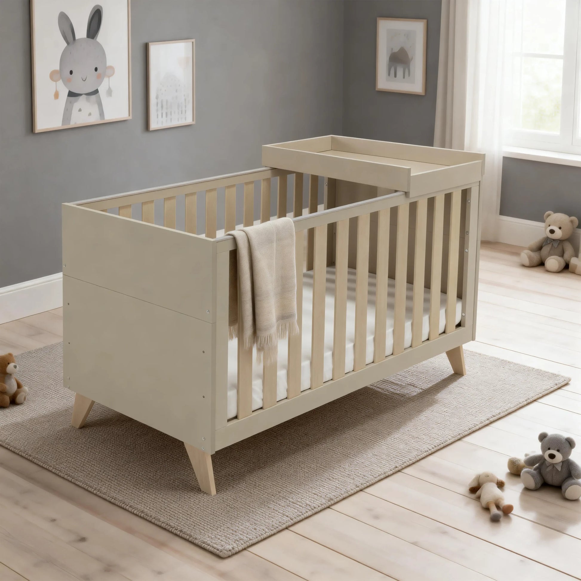 - Stylish cot bed with matching cot top changer