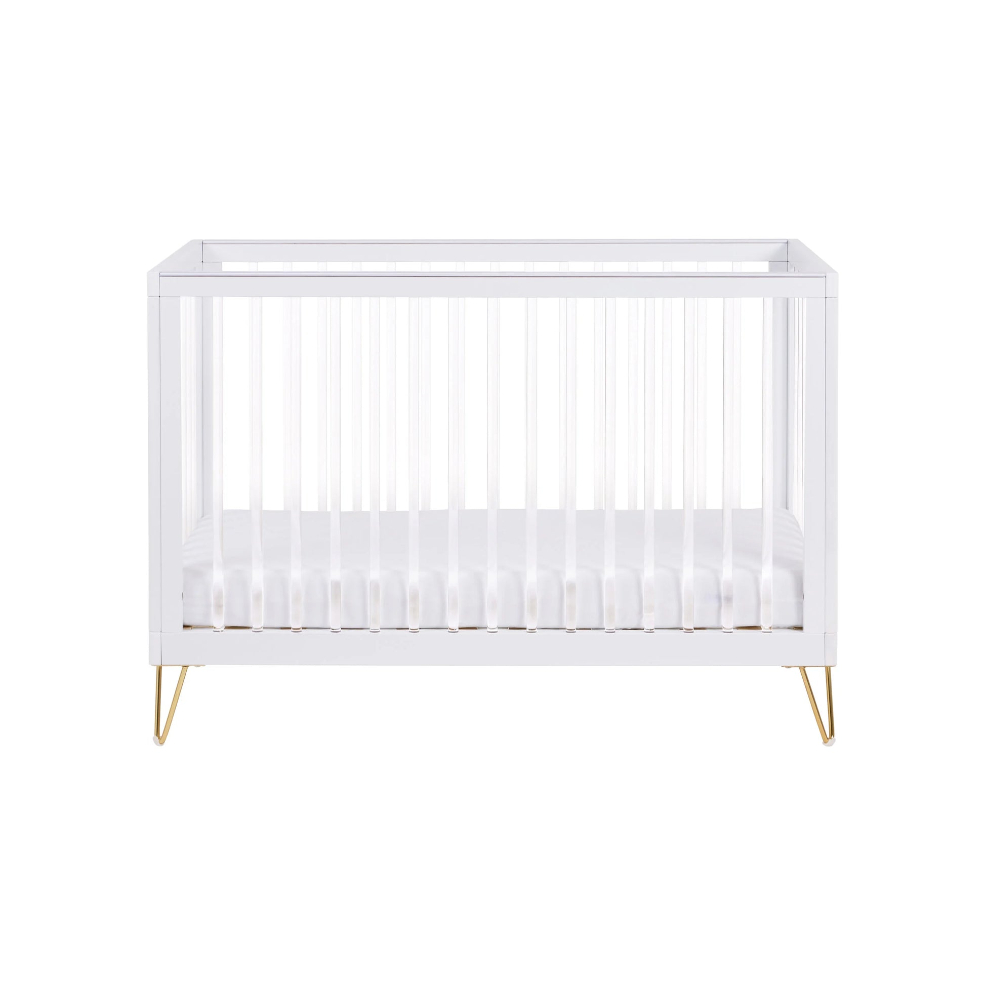 The stunning Babymore Kimi convertible cot bed will be the standout piece of furniture in your nursery. An exquisite combination of contemporary wooden style, modern acrylic and retro hairpin legs all blend seamlessly to provide a striking fashion statement. The 100% recyclable, non-toxic acrylic provides an airy, open feel that allows full visibility of your little one from any angle. The Scandi-inspired cot bed has been stylishly designed with retro hairpin legs. It offers 3 adjustable mattress heights, teething rails, and can be transformed into a toddler bed, suitable from birth to 4 years old. The hairpin legs are made of high quality steel wire, stable, sturdy and durable, and come with floor protectors included.