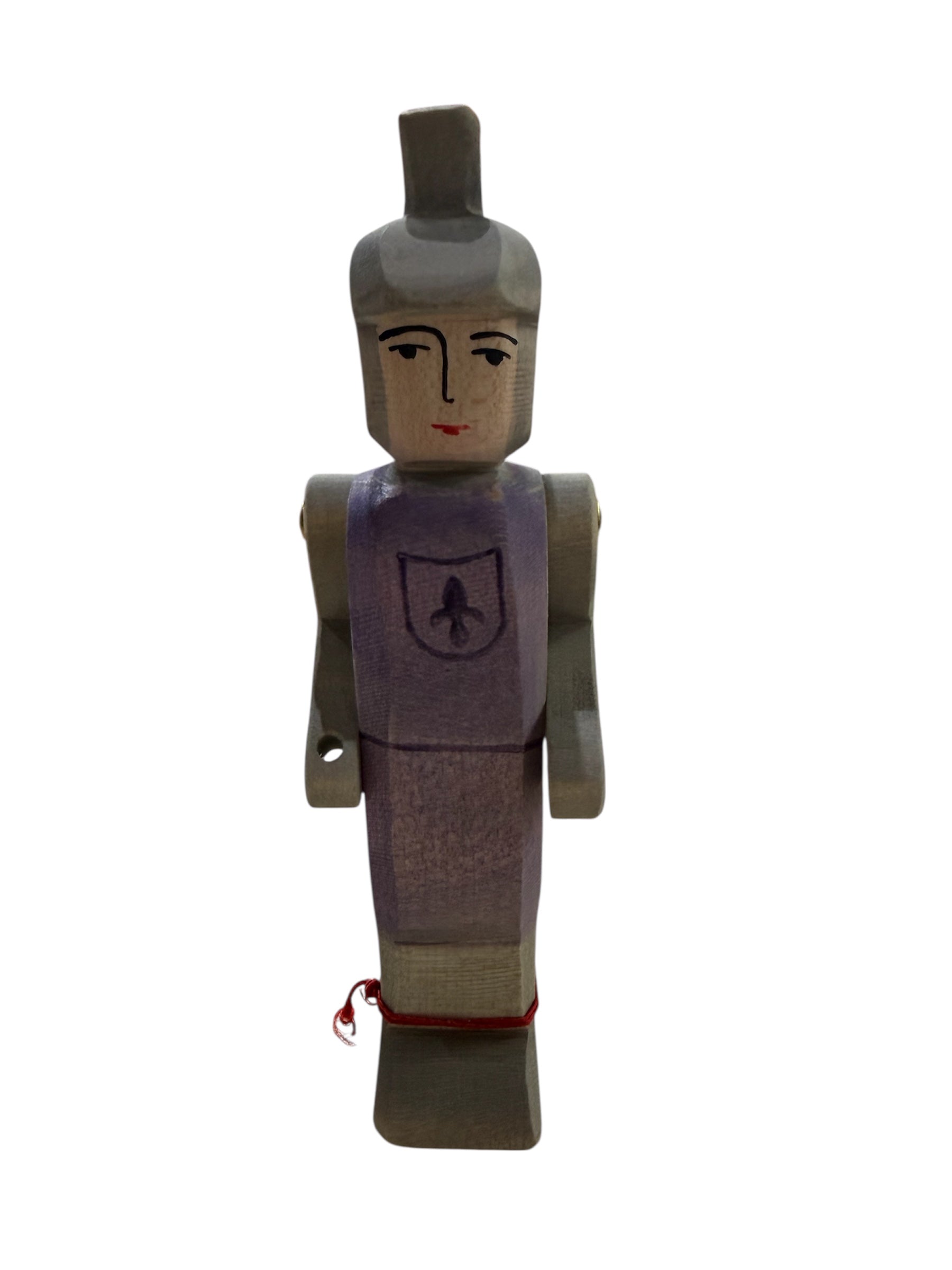 This wooden knight is ready for battle, dressed is in full armour with a grey helmet, a shield on one arm and a sword in the opposite hand. Both arms are moveable and posable and the sword and shield are removable.