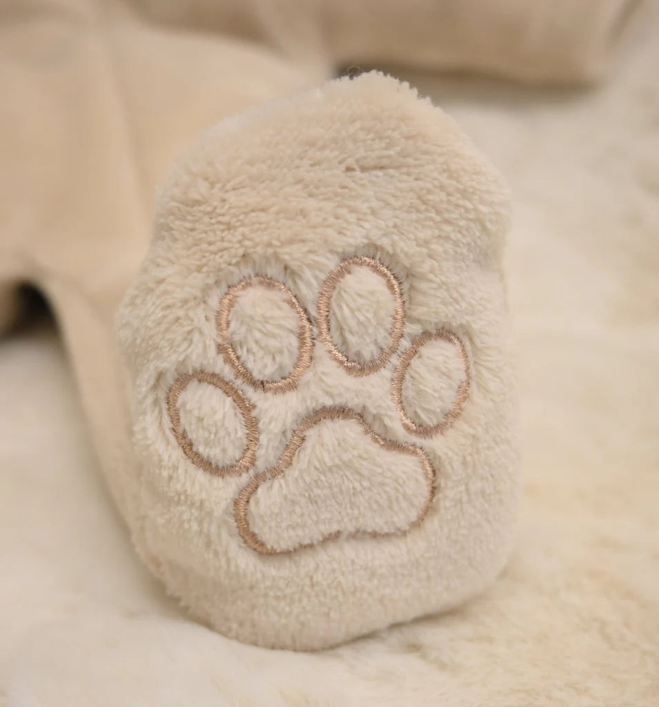 Pex Snuggle Sleepsuit Natural is made in our ultra cosy fleecy fabric, this cute little sleepsuit is perfect for snuggling up on chilly days. With a convenient zipped fastening from the neck to the feet and a cuddly hood that has sweet little ear appliques. The bottom of the feet include lovely embroidered paw prints.