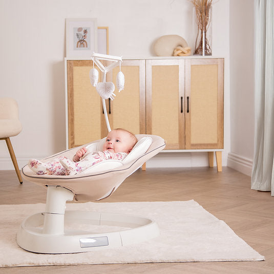 We all know that babies are happiest when held or rocked and the Sway Swing will help make your baby incredibly happy and content. Featuring calming side to side swaying action to replicate a soft rocking motion along the sounds of soothing music and lullabies. Fully supported in a deep padded soft seat with added head protection. Modern toy bar with cute soft hanging toys for baby’s attention. Lightweight and easy to move around, you will not want to be without the Sway Swing.